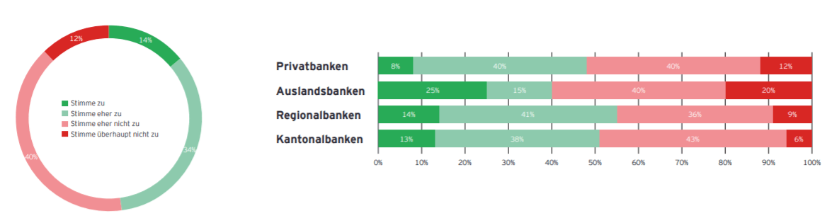 Immer wieder rückt auch der hohe Stromverbrauch von Bitcoin durch das Mining mittels des Proof-of-Work-Konzeptes in den Vordergrund. Gerade Klimaaktivisten sehen in Bitcoin daher eine Gefahr. Die Studie befasste sich auch mit dieser Thematik. Im Genauen hiess die Frage: „Wie stehen Sie zur folgenden Aussage: Das Angebot von Anlagemöglichkeiten in Kryptowährungen ist nicht mit den Nachhaltigkeitszielen unserer Bank vereinbar.“