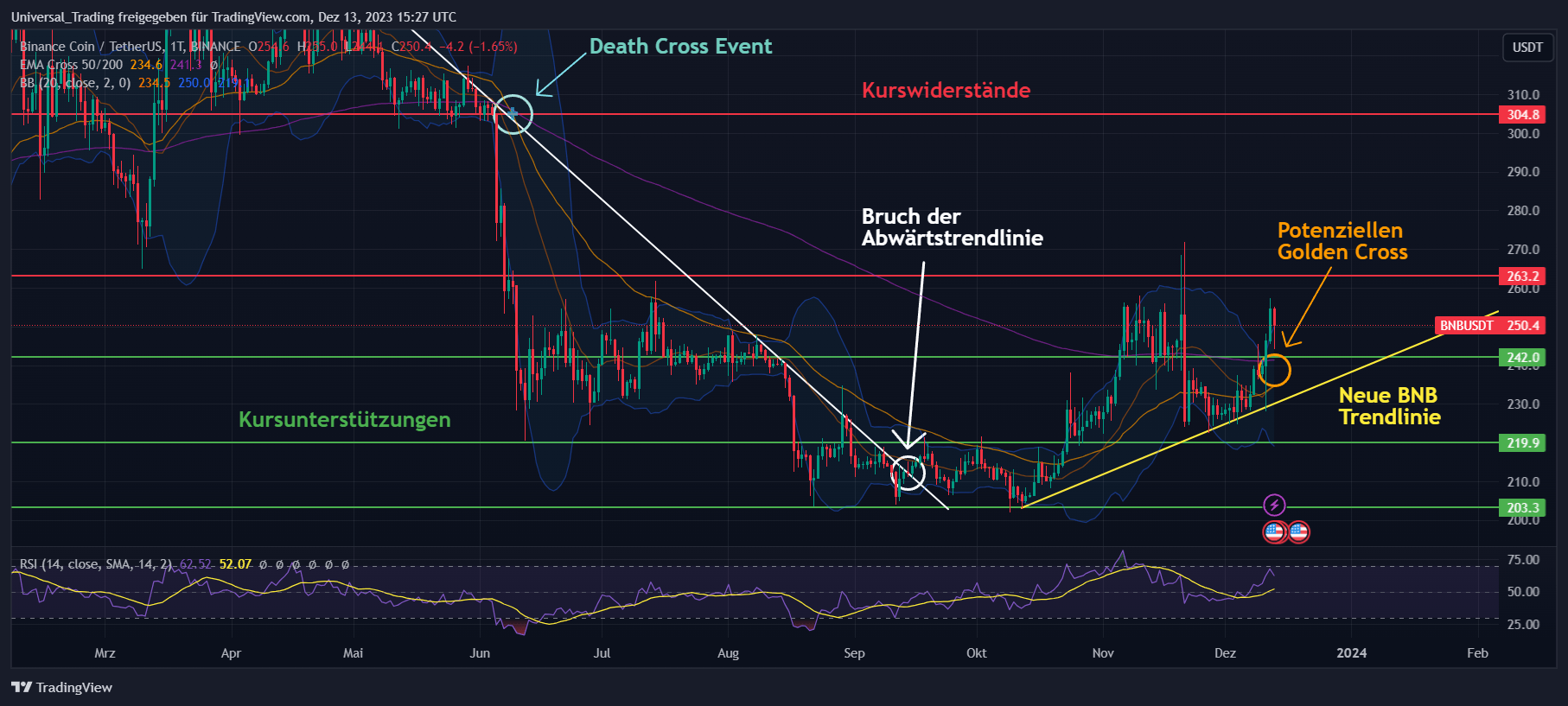 Im Jahr 2023 begann BNB stark, erlebte jedoch im Laufe des Jahres einen Abwärtstrend, der seinen Höhepunkt in einem deutlichen Preisrückgang fand. Der Kurs stieg zunächst auf rund 340 US-Dollar, bevor er stark abfiel. Im Verlauf des Jahres zeigte sich ein „Death Cross“ im Chart von BNB, ein typischerweise bearishes Signal, das auf einen möglichen weiteren Preisrückgang hindeutet.