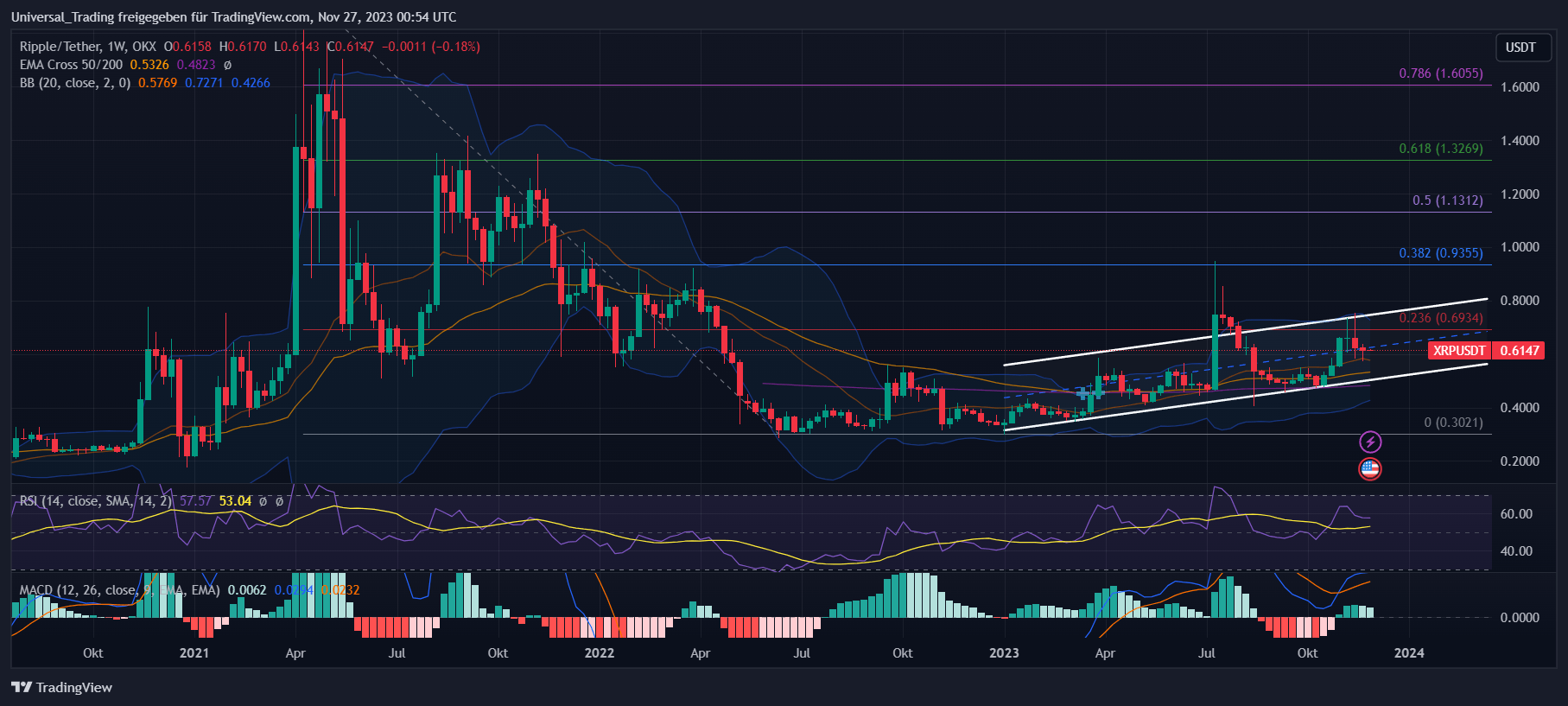Seitdem hat sich der Kurs verdoppelt und steht aktuell bei 0,615 US-Dollar. Trotz eines Rückschlags nach positiven Nachrichten bezüglich des Rechtsstreits mit der SEC konnte sich XRP am oberen Ende des Trendkanals stabilisieren. Die Fibonacci-Retracements bieten uns wichtige Anhaltspunkte für potenzielle Widerstände und Unterstützungen des XRP Kurses und werden somit für die Chartanalyse angewendet. Eine Schlüsselmarke ist hierbei das 0.236-Level bei 0,693 US-Dollar, nahe am aktuellen Kurs. Für weiterführende Kursanstiege wird das 0.382-Level bei 0,935 US-Dollar entscheidend sein.